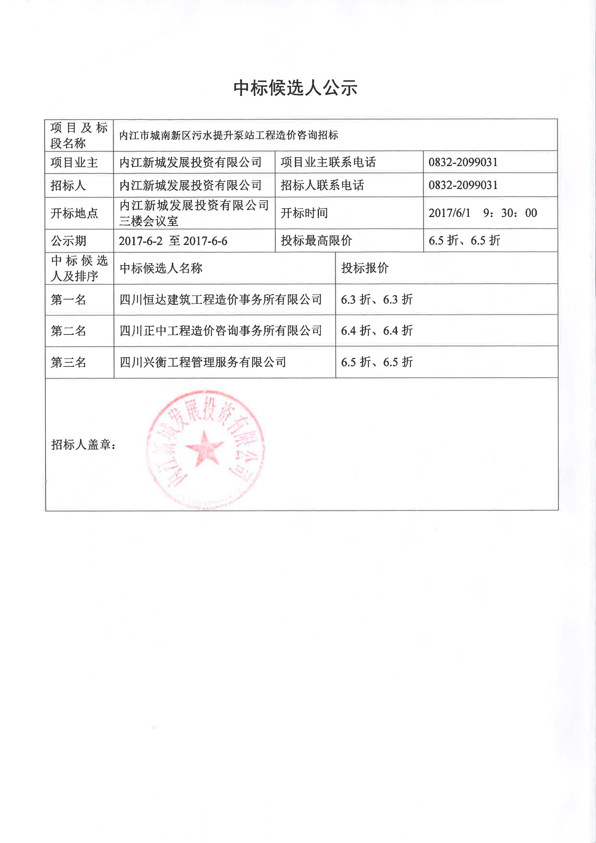 城南新區(qū)污水提升泵站工程造價咨詢招標(biāo)中標(biāo)候選人公示