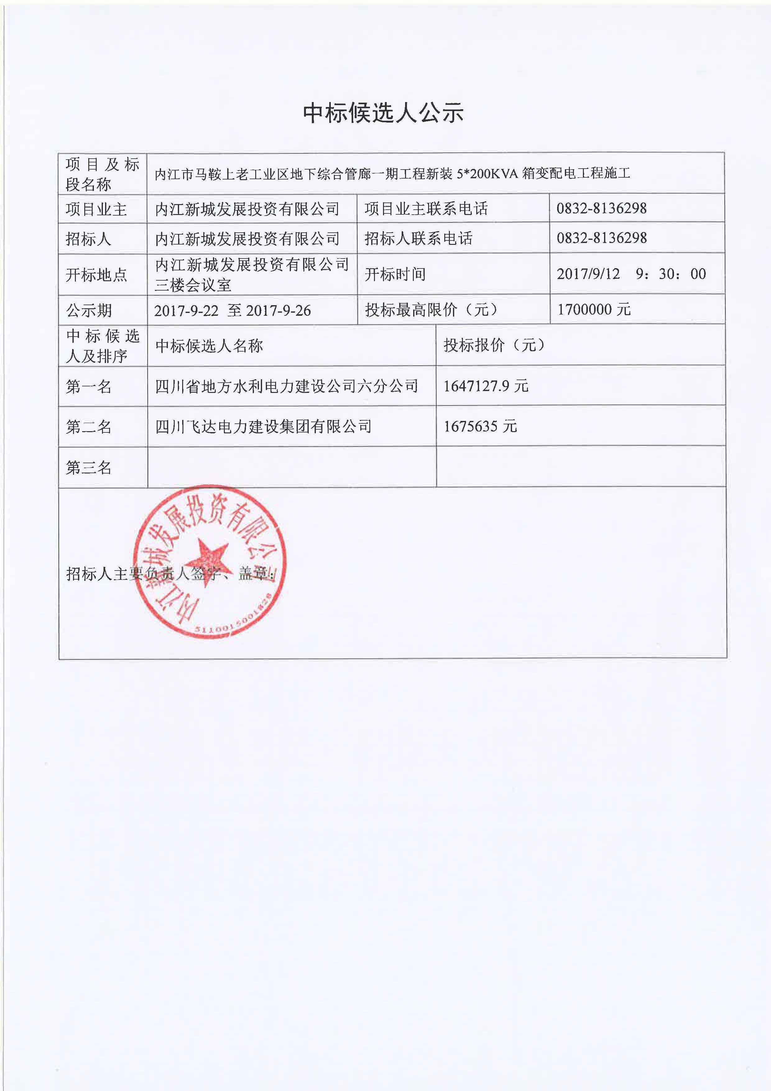 綜合管廊一期新裝5*200KVA箱變配電工程施工中標(biāo)候選人公示
