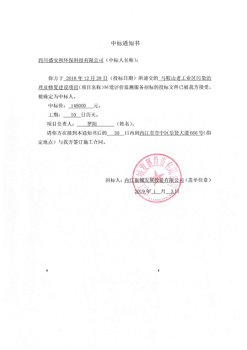 馬鞍山老工業(yè)區(qū)污染治理及修復(fù)建設(shè)項(xiàng)目中標(biāo)通知書