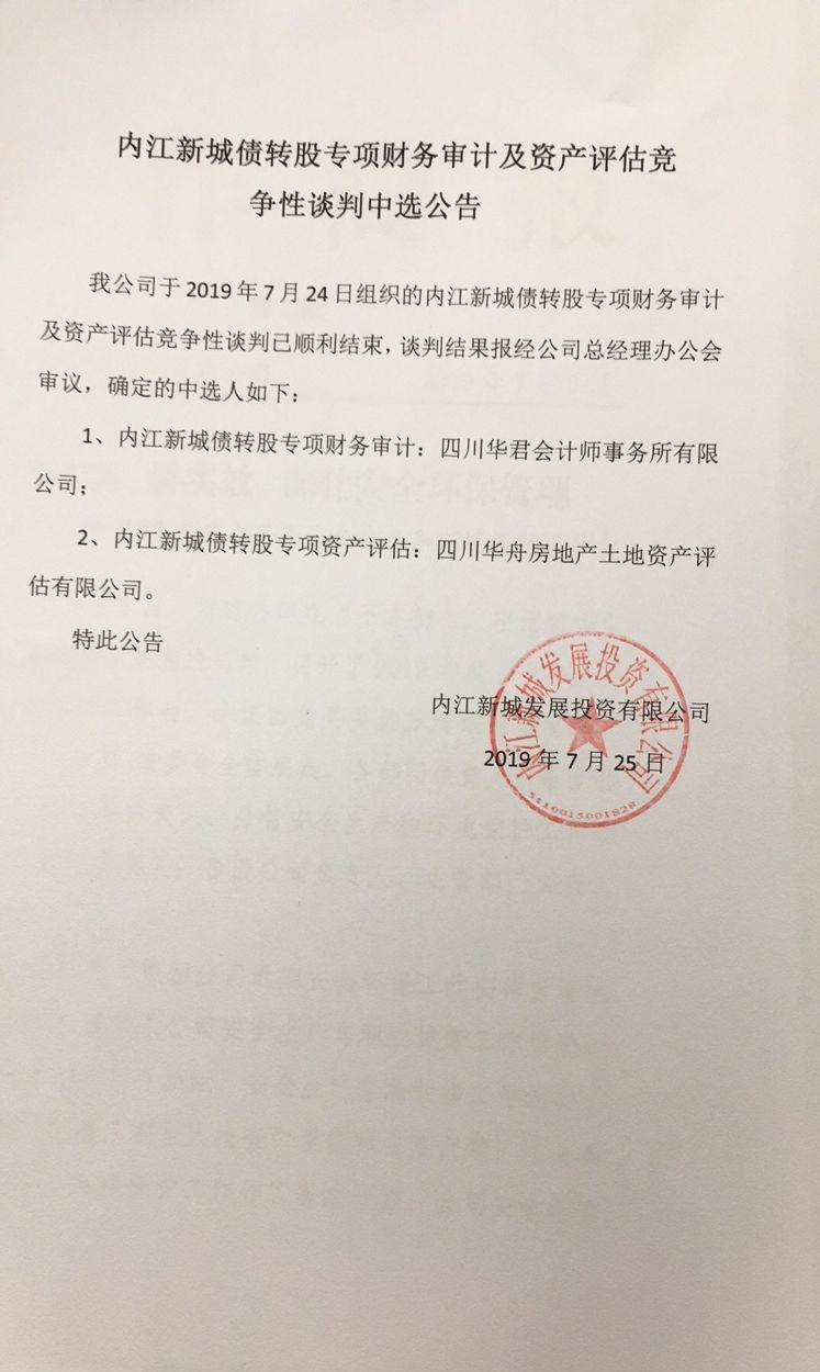內(nèi)江新城債轉(zhuǎn)股專項(xiàng)財(cái)務(wù)審計(jì)及資產(chǎn)評(píng)估競(jìng)爭(zhēng)談判中選公告