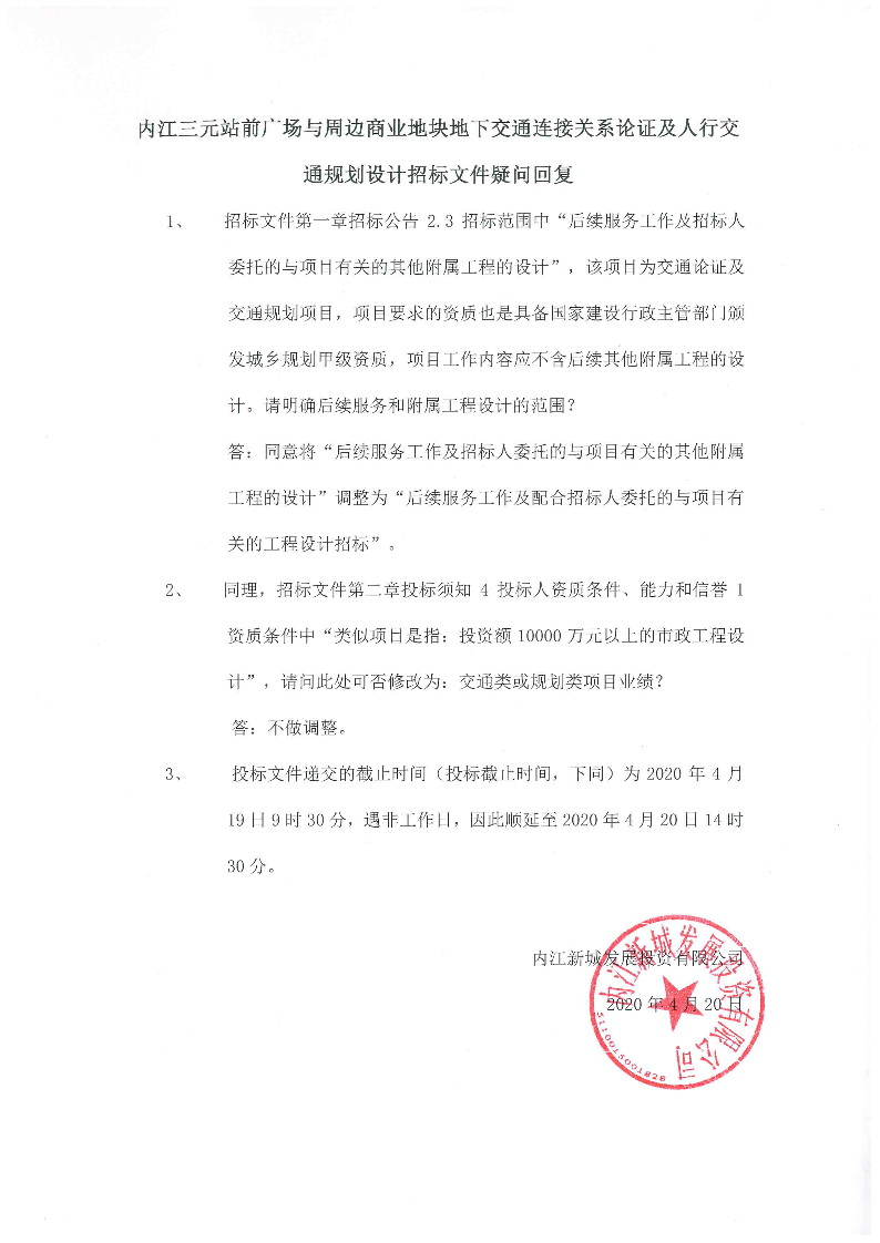 內(nèi)江三元站前廣場與周邊商業(yè)地塊地下交通連接關(guān)系論證及人行交通規(guī)劃設(shè)計(jì)招標(biāo)文件疑問回復(fù)